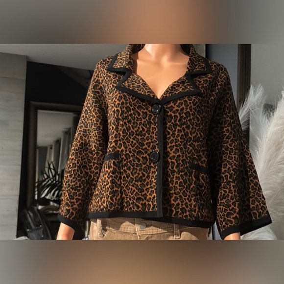 This Nine West blazer features a striking brown and black leopard print, offering a bold statement piece for any wardrobe. Crafted with a plush, soft fabric, it boasts a relaxed, boxy silhouette with three-quarter length sleeves, making it both stylish and comfortable. Ideal for adding a touch of sophistication to your ensemble.