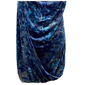Beautiful black & blue with a purple hue burnout velvet with a small drape neck and a drape from armpit to hem
