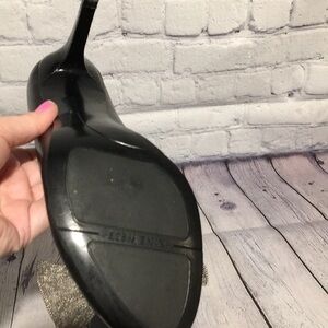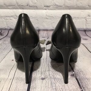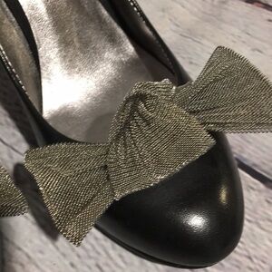 Nine west Carmelita black leather heels with gray gunmetal mesh bows