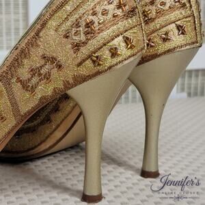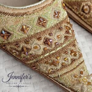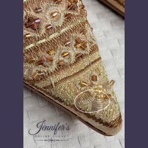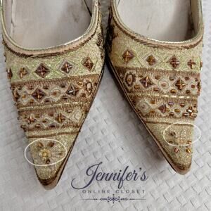 NOTED FLAWS: Just a small number of flaws. A few missing beads, mainly on the pointed toe. Heels have a few superficial scratches. (Noted in Photos). Both of these flaws are hard to see from afar due to the beaded and threading detail. Typical wear on soles (noted in photos). The footbed also has wear (also noted in photos).