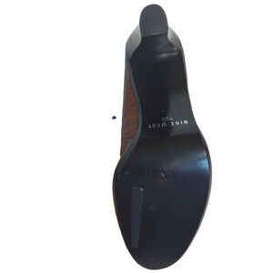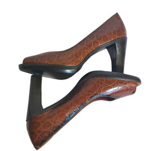 Nine West Cognac Alligator Embossed Leather Open Toe Heels Block Heel