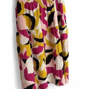 Turn heads in this vibrant Nine West midi skirt featuring a bold abstract print in pink, yellow, black, and white. With a comfy smocked waistband, A-line silhouette, and lightweight, fully lined fabric, this skirt is perfect for sunny days, brunch dates, or vacation vibes. Like new and ready to style!