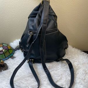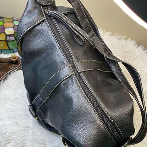 Keywords: Nine West, leather backpack, women's backpack, black backpack, casual backpack, medium size, adjustable straps, durable construction, front buckle pocket, zippered pocket, everyday use, pre-owned backpack, genuine leather, high-quality stitching, fabric lining