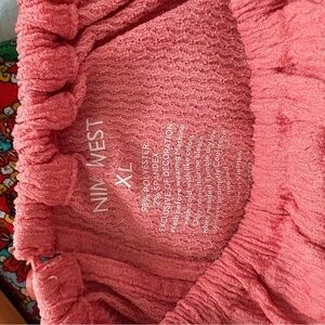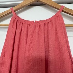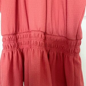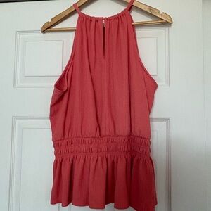 This sleeveless tank top by Nine West features a charming smocked design and a playful peplum hem, all in a delightful coral hue. The lightweight fabric ensures a comfortable fit, making it a perfect choice for casual outings or a day at the office. Looks amazing paired with white pants or jeans. Ships from South Carolina, smoke free home.