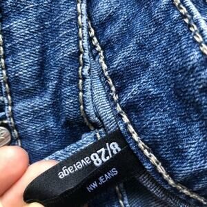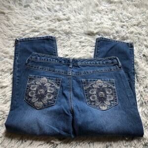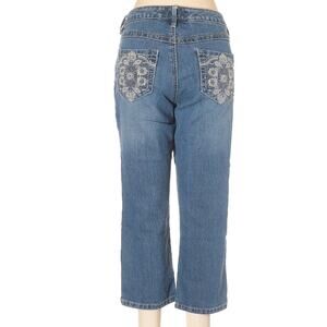 Size 8 from Nine West. Straight leg cut cropped medium wash denim jeans with a mid rise waist. Good condition. I believe some of the rhinestones on the pockets might have come off, but it’s hard for me to tell. Pockets are pictured so take a gander!