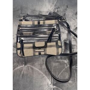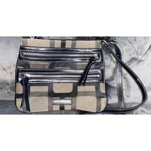 Beautiful cross body bag by Nine West. Dark chocolate almost black leather Crossbody strap. There are two zippers in the front and one interior zippered pocket closure is zipper as well. Very clean inside and out strap is in excellent condition.