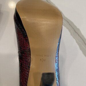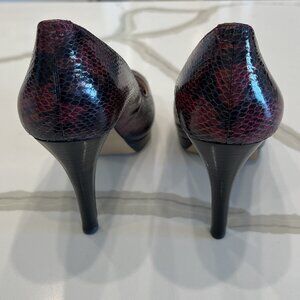 Nine West Danee Snake Skin Peeptoe Pumps in Black Cherry/Burgundy Print. These are in like new condition. The platform is 1/2 inch and the heels are 4 inches.