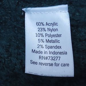 • material: 60% acrylic, 23% nylon, 10% polyester, 5% metallic, 2% spandex
