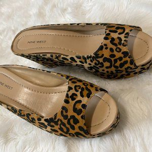 Nine West "Dayside" Leopard Fabric Comfortable Slip on peep toe Wedges 10