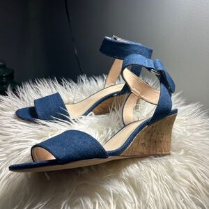 Nine West Denim 3 inch Wedge Sandal with Ankle Strap, and cork heel. Size 10.