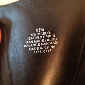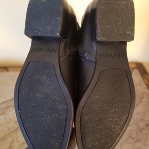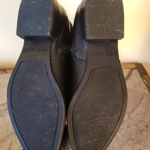 Nine West Diablo tall black leather riding boots, with silver buckle detail, size 8.5 M, excellent condition, worn once. Soft leather, round toe. 1" block heel. 15" boot shaft; 14.5" calf circumference. On the inside by the stitches leather started to detach very little on the the right and slightly more on the left, not from wear but from sitting in the closet.