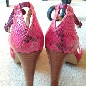 An alluring peep toed leather platform heels with beautiful open tear drop styling at the back. The most prominent colour is red, but the back piece is an iridescent fushia colour and the slender ankle strap is purple. They are gently used. Left shoe has a reinforced piece on the ball of the foot, can be removed. The height is about 4.5" with the platform measuring approximately 1".