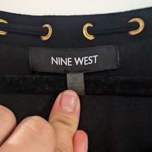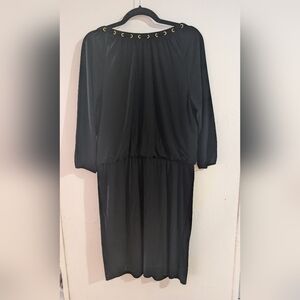 This elegant black dress features stylish gold accents, perfect for any occasion. Its sleek design offers a sophisticated look.