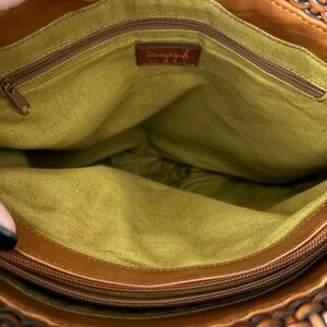 Chic brown woven handbag with a stylish olive interior. Ideal for daily use.