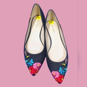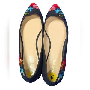 Nine West | Embroidered black pointed toe slip on flats with vibrant embroidered flowers| Size 9, excellent condition.