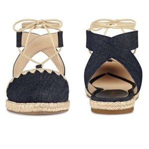 Chambray and cream lace up espadrille flats. Beautiful coloring with the deep blue chambray and eye popping cream trim and laces make for a beautiful piece for any wardrobe.