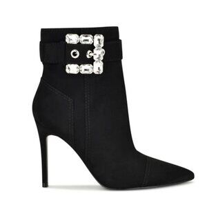 Step out in style in the Nine West Fabrica dress booties. This bootie features a high stiletto heel, stylish pointy toe and an embellished buckle detailing. This bootie is anything but boring, founded in 1978, Nine West empowers women to take on the world in style, from day to night.