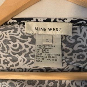 Gently worn Nine West faux wrap dress in grey pattern. This is an extremely flattering and comfortable dress. The top has a gentle wrap design with gathering at the waist that creates shape. The bottom is loose and straight with no wrap, so no wardrobe malfunctions. The fabric has stretch making it comfortable for all day. I wore this to work only. From a smoke and pet free home.
