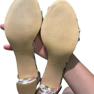 Nine West sandals, floral block heel, ankle strap heels, size 9 women’s shoes, spring summer heels, wedding guest shoes, garden party heels, floral print sandals, dressy summer shoes, chic block heels