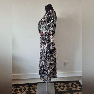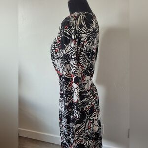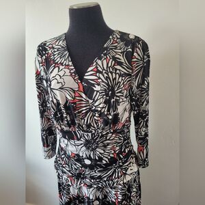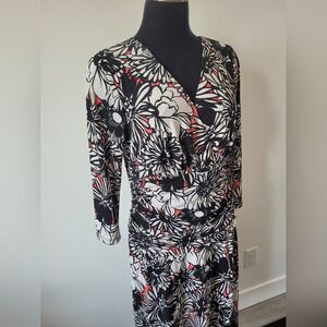 Super cute and comfortable midi length dress with a black, white and pink floral print. The midsection has a stretchy ruched band which makes it maternity friendly. ¾ length sleeves, faux wrap V neckline, comfortable jersey material. Great condition. Size 12, measures approximately 45 inches long 18.5 inches underarm to underarm laid flat 32 inch waist.