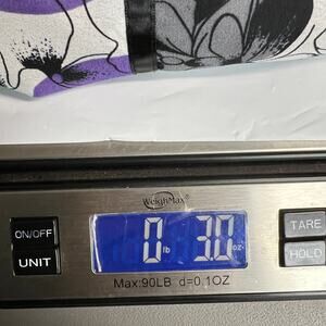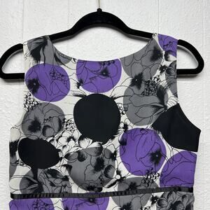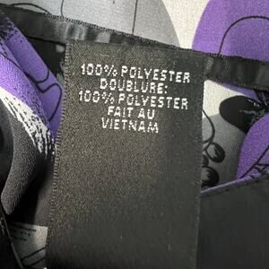 Nine West chiffon floral top in white, purple, gray, and black. Cross over v-neck. Sleeveless. Accentuated waist. Ruffle hem. Hidden side zipper. Lined except bottom ruffle. Lightweight. In good used condition. No stains, tears or holes.