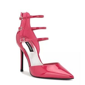 Elevate your style with these striking pink heels from Nine West, featuring a glossy patent leather finish and a chic triple ankle strap design. The pointed toe and stiletto heel add a touch of sophistication, while the bold color ensures you stand out in any crowd.
