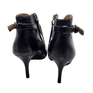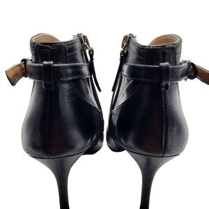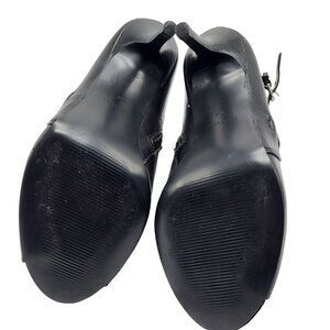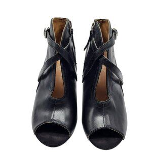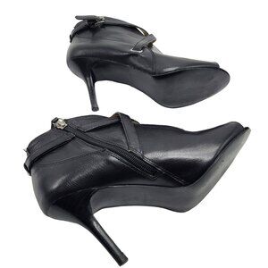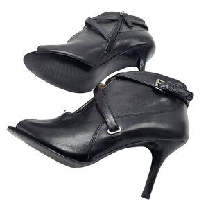 Nine West Gaige Open Toe Black Leather Heeled Bootie Women Size 7.5 Side Zip Buckles