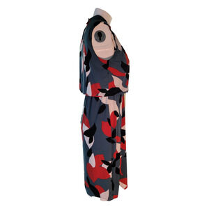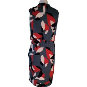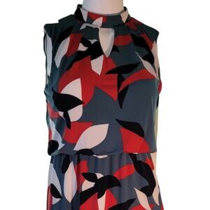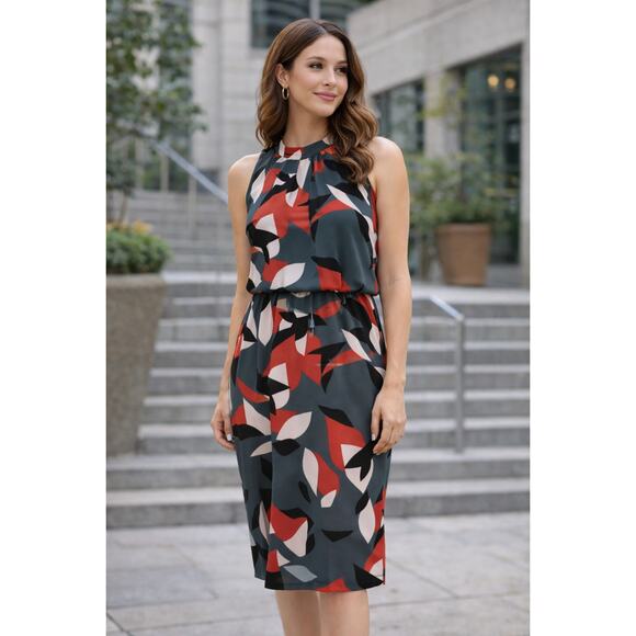 Bold, artsy, and unapologetically graphic — this Nine West sleeveless blouson dress brings strong indie energy with a polished, grown-up edge. The abstract geometric print mixes teal green, gray, burnt orange, red, and white for a statement look that feels creative without being loud. Designed with a flattering blouson silhouette and elastic waist that defines shape while staying comfortable, this piece easily transitions from office wear to gallery openings, dinners, or weekend travel. Sleeveless cut keeps it versatile for layering with a blazer or cardigan, while the subtle cut-out and button detail at the neckline adds interest without going over the top.