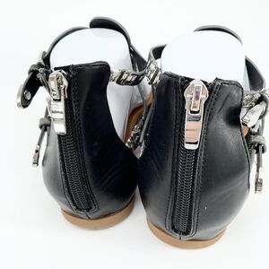 Adjustable Buckles on ankle straps and rear zip for closure. Thong sandals style.