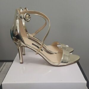 Elevate your style with these stunning gold heels from Nine West, featuring sleek stiletto heels and elegant ankle straps. The metallic finish adds a touch of glamour, making them perfect for any special occasion. With an open toe design, these heels offer both sophistication and a modern edge.