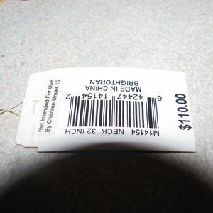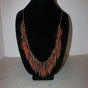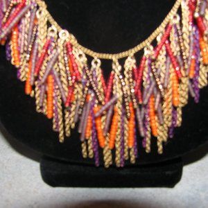 This is a 32 inch Nine West gold tone, glass seed beaded necklace. The color are orange, brown, red, purple, gold tone, bronze and the design is dangle/fringe look. Very well made and pretty heavy. Still has original tag with the 110.00 original price tag. It is in unworn condition. Has the stamped Nine