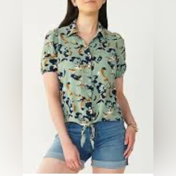 Nine West Green Floral Shirt Blouse Size Medium Abstract Button Tie Front SKU 9
