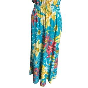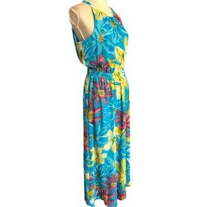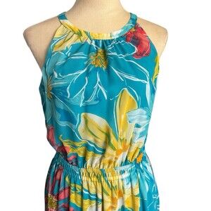 The Nine West Halter Neck Maxi Dress in size 6 features a vibrant aqua multi floral chiffon design, perfect for a variety of occasions such as weddings, parties, or casual outings. The sleeveless dress with a halter neckline , Elastic Waist and button closure exudes a beachy, colorful, and bohemian vibe. Made from lightweight polyester chiffon, this long dress is lined for added comfort and is ideal for wearing in the summer, fall, or spring seasons. Perfect for those looking for a stylish and versatile piece to add to their wardrobe.