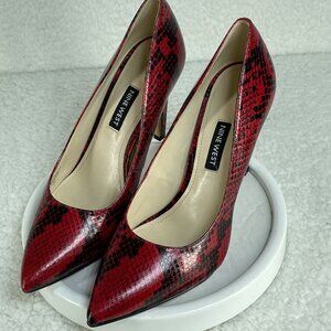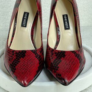 These Nine West stiletto pumps in women's size 7M, featuring a red and black animal print pattern with a pointed toe. These slip-on heels have an ultra-high stiletto heel of 4 inches. The shoes are designed for formal occasions, workwear, or parties, and are tailored for comfort with a cushioned insole. The Nine West Tatiana model offers a classic pump style with a modern twist. See the photos for details.