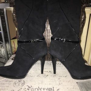 Black Knee high boots.. Classy Sexy with patent leather on heel and edges... In great condition...Just tiny little scratches barely visible, and top of buckle was cut so wouldn’t bend when stored...