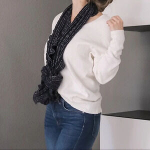 A scarf is such a versatile accessory with more ways than one to wear it! This one has metallic throughout and is a beautiful dark plum color. I love the ruffled edges! It’s super stretchy with 89% acrylic and 20% lurex. Infinity style 13”x 29” without stretching.