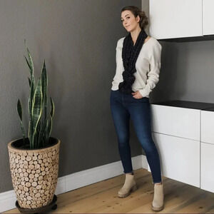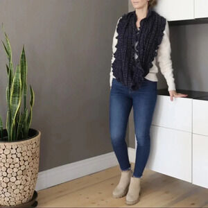 A scarf is such a versatile accessory with more ways than one to wear it! This one has metallic throughout and is a beautiful dark plum color. I love the ruffled edges! It’s super stretchy with 89% acrylic and 20% lurex. Infinity style 13”x 29” without stretching.