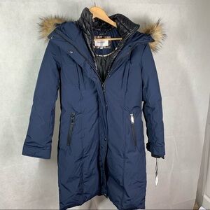 Nine West Hooded long parka in size small. New with tag, no flaws. Dark Navy color, faux fur trim detachable hood, 2 zippered pockets and 2 chest button pockets, contoured fit, zipper and button for closure as an added warmth. Knee length. Measurements are approximates only