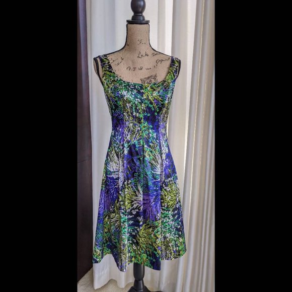 Beautiful dress in purple and green floral design. Attention has been made to the details with its great lines and flattering shape. Zipper on the back and surprisingly easy to open and close. See pics to appreciate them! Stretchy material - can fit size 6/8. Only used once. Great shape.