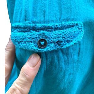 Really cute 100% cotton top with loose elastic waisted hem, two pockets on yoke and lace details on the pocket flaps and back yoke .Adorable! Small closeable pockets on front with embroidered flap