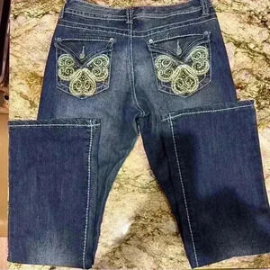 Slightly Flared Nine West Jeans. Beautifully embroidered back patch pockets, and button-down flaps. Heavy decorative topstitching and rhinestone accents. Rise is 8” w/ 4” zipper. see photo for more measurements.