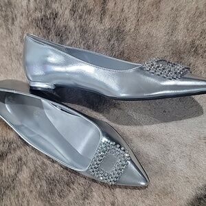 Nine West Jesike Pointy Toe Silver Flats Dressy Glam Rhinestones Slip On Sz 8.5