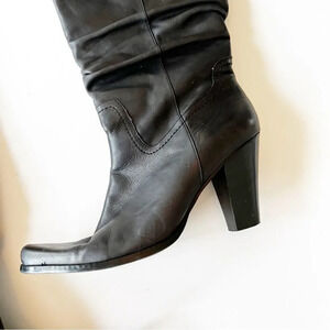 Nine West June black leather boots size 8.5. 14” shaft with 3” heel. Pull on slouchy style. Perfect for your spooky season looks. Preowned, very light overall wear.
