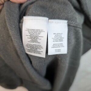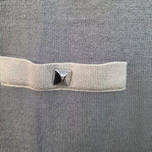 Nine West knitted sheath dress, size M, featuring a gray design with contrasting metallic trim, 3/4 sleeves, decorative front accents, and a pull-on style for a sophisticated look.