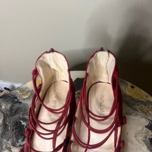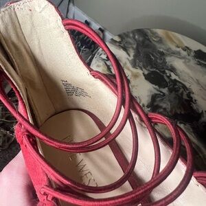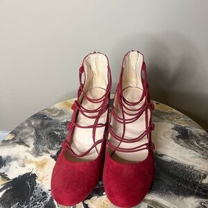 Beautiful red heels with straps across the foot and up the ankle in a comfortable elastic. Red buttons up the shoe keep in place. Block heel makes these easy to walk in and comfortable. Zipper at back. Worn once, great condition. See wear as photographed. Size 7.
