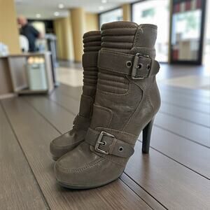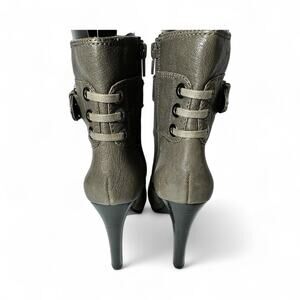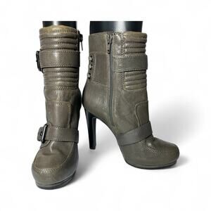 Nine West Leather Disheveled Heeled Boots Olive Green Side Zip Buckles 8.5 M
