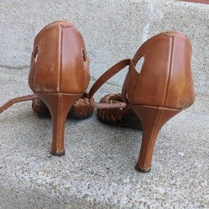 Good condition, used Nine West Heels. Brown woven leather. Adjustable ankle strap. Minor defects from gentle use. Low heel height. Lovely detailed heels with a sleek profile. An asset to your closet as these heels can accent a conservative outfit, dress down with a pair of jeans, or compliment a bohemian look.