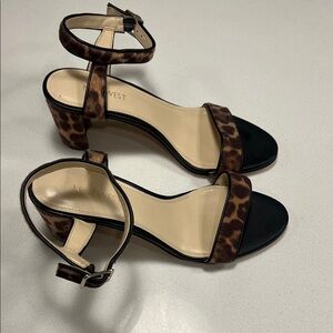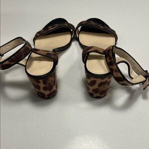 Stylish leopard print sandals. Features adjustable ankle strap. Comfortable and elegant design.