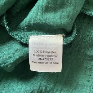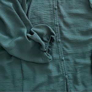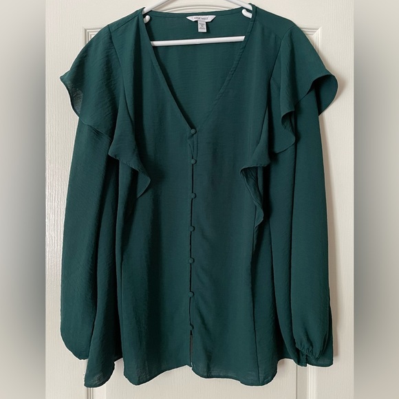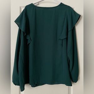 Extremely gently loved and in excellent condition Nine West long sleeve blouse in size 3X. This absolutely gorgeous blouse is a stunning dark emerald green color. It features a V-neckline, button down front, ruffle shoulders and elastic cuffs. It measures 30” from armpit to armpit and is 27” long with a 24” sleeve. Made of 100% polyester. Machine wash.