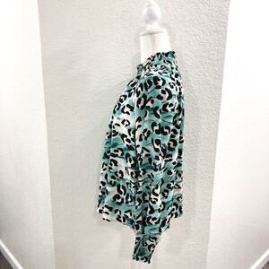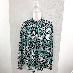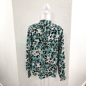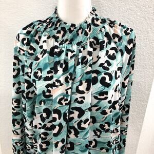 Nine West Long Sleeve Smocked Leopard Print Green Top Blouse